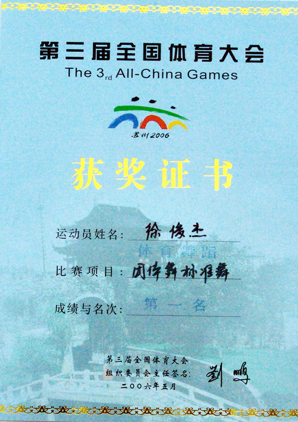 徐俊杰同学获第三届全国体育大会"团体舞标准舞"第一名