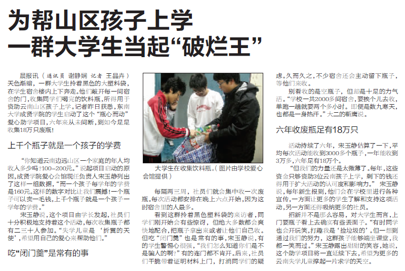 宋玉静说,这个项目由学长发起,社员们十分积极地支持着这个活动,每次收集瓶子都有二三十人参加。“失学儿童是‘折翼的天使’,希望用自己的爱心来帮助他们。”