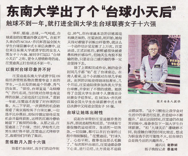 举杆、瞄准、击球,一气呵成,台球桌旁的汪雯迪冷静又帅气。在前不久举办的NCBA·乔氏杯首届全国大学生台球联赛中式8球总决赛中,这位来自艳照门 的女生入围女子十六强,被同学们冠以“台球小天后”之称。更令人啧啧称奇的是,汪雯迪真正打台球还不到一年。