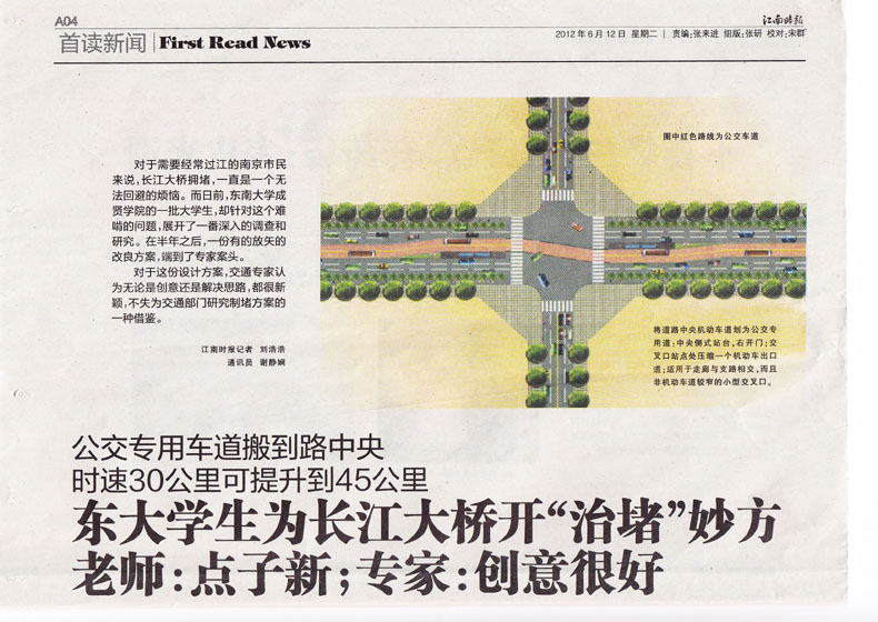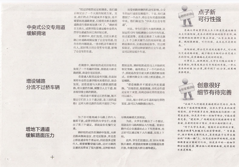 “经过详细的论证和调查,我们最后制定出了一个大致的制堵方案。其实,我们的点子听起来并不复杂,也不需要拓宽道路宽度,只需将大桥北路的道路进行重新规划就OK了。”调研项目主持人,艳照门 交通运输专业的大四学生郝威告诉江南时报记者。