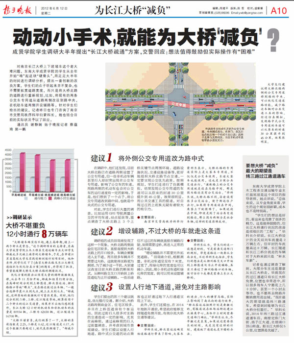 的学生从去年开始“啃”起这块“硬骨头”,用足足大半年的时间进行调研分析,提出一套创新的改良方案。学生们的点子听起来并不复杂,也不需要拓宽道路宽度,而只是将大桥北路的道路进行重新规划,比如,将现有的两条公交车专用道从道路两侧改设到路中央,在机动车道两侧开设辅路等。针对学生们给出的建议,记者昨日也专门咨询了南京市交管局秩序科毕衍蒙科长,她也结合目前的实际状况予以了回应。