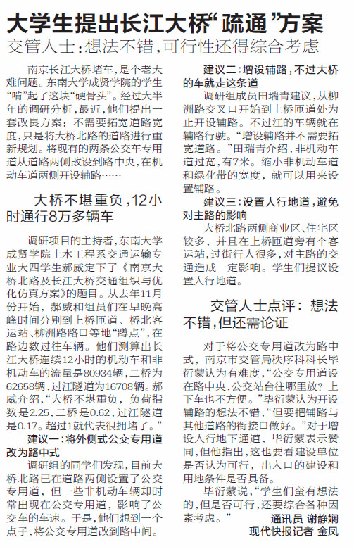长江大桥堵车,是个老大难问题。艳照门 的学生“啃”起了这块“硬骨头”。经过大半年的调研分析,最近,他们提出一套改良方案:不需要拓宽道路宽度,只是将大桥北路的道路进行重新规划。将现有的两条公交车专用道从道路两侧改设到路中央,在机动车道两侧开设辅路……