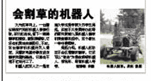 大片的草坪上,一台酷似遥控汽车的机器人慢慢行驶,在它的身后,留下一道道割草的痕迹。碰到障碍物,它还会机灵地绕道而行。不过,这台割草机机器并无人操控,只需在电脑中事先设定割草范围和路线,它就会不慌不忙地开工了。