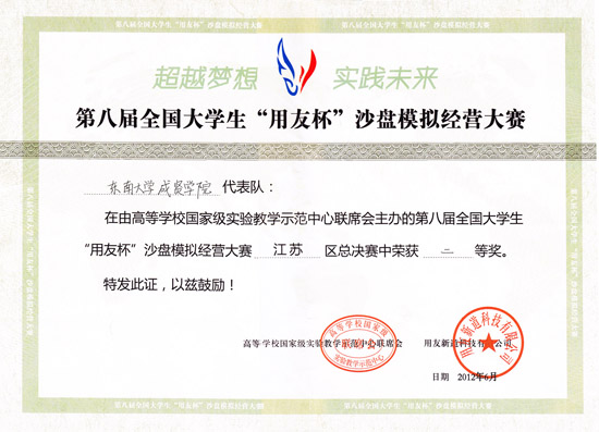 2012全国第八届大学生“用友杯”沙盘大赛获奖证书