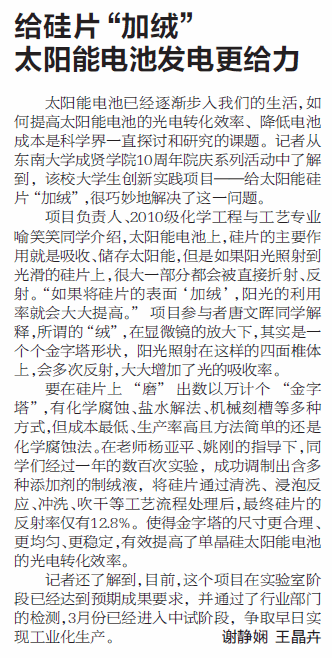 【南京晨报】给硅片“加绒”太阳能电池发电更给力