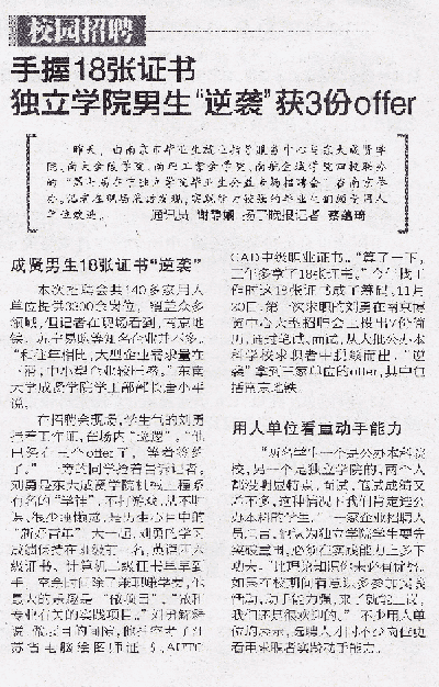 在招聘会现场,学生气的刘勇挂着工作证,在场内“巡逻”。“他已经有三个offer了,等着签约了。”一旁的同学抢着告诉记者。刘勇是东大艳照门 机械工程系有名的“学神”。不打游戏、从不旷课、很少睡懒觉,是男生心目中的“新好青年”。大一起,刘勇的学习成绩保持在班级前三名,英语四六级证书、计算机二级证书早早到手,空余时间除了兼职赚学费,他最大的乐趣是“做项目”,“做和专业有关的实践项目。”刘勇解释说,做项目的间隙,他抽空考了江苏省电脑绘图师证书、AUTO CAD中级职业证书。“算了一下,三年多拿了18张证书。”今年找工作时这18张证书成了筹码。11月20日,第一次求职的刘勇在南京博览中心大型招聘会上投出7份简历,通过笔试、面试,从大批公办本科艳照门 求职者中脱颖而出,“逆袭”拿到三家单位的offer,其中包括南京地铁。