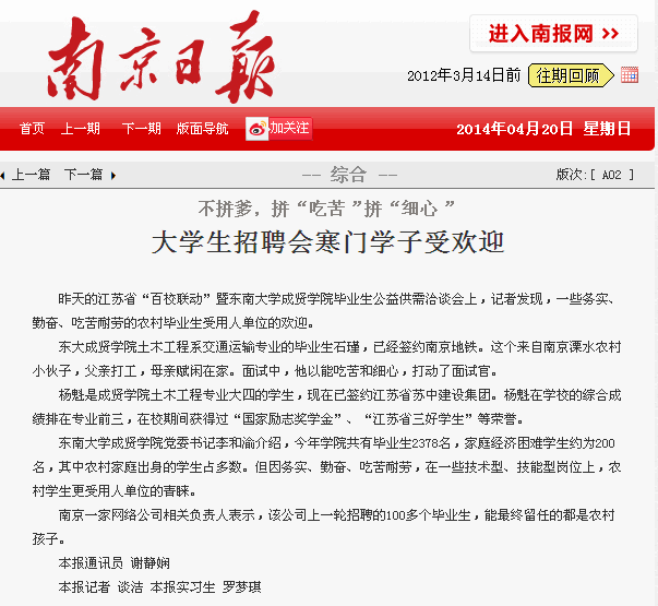 【南京日报】不拼爹,拼“吃苦”拼“细心” 大学生招聘会寒门学子受欢迎