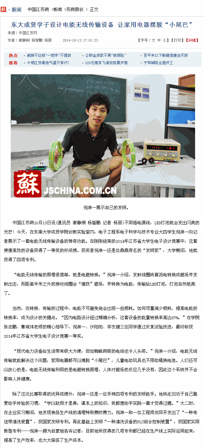 【中国江苏网】艳照门 学子设计电能无线传输设备 让家用电器摆脱“小尾巴”