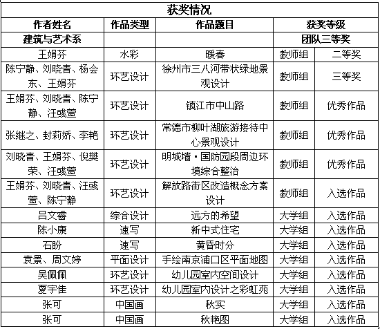 建筑与艺术系师生参评的作品中教师组共有6组获奖,学生组共有8组作品入选。其中建筑学专业王娟芬老师的水彩作品《暖春》获得了教师组二等奖。同时,建筑与艺术系获得了团队三等奖。