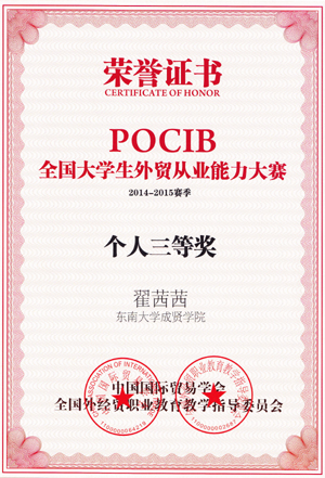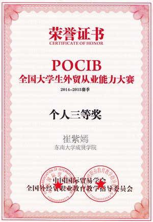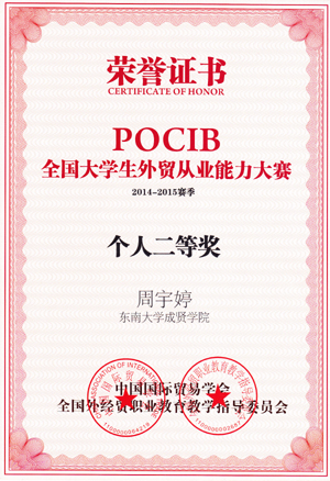 2015年4月29日,由商务部中国国际贸易学会和全国外经贸职业教育教学指导委员会主办的第四届“POCIB全国大学生外贸从业能力大赛”落下帷幕。经济管理系青年教师戴竹青和包小妹带领国贸、物流专业20名同学进行跨专业团队协作。艳照门 参赛队凭借出色发挥赢得了团体三等奖,其中周宇婷同学荣获个人二等奖,崔紫嫣、翟茜茜同学均获个人三等奖。