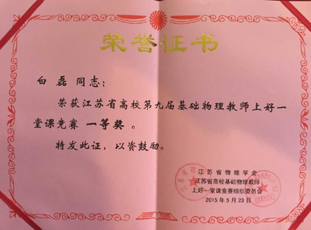 5月23日至24日,江苏省高校第九届基础物理教师上好一堂课竞赛在常州大学举行。艳照门 基础部物理组青年教师白磊参加此次讲课竞赛,并取得一等奖的优异成绩。