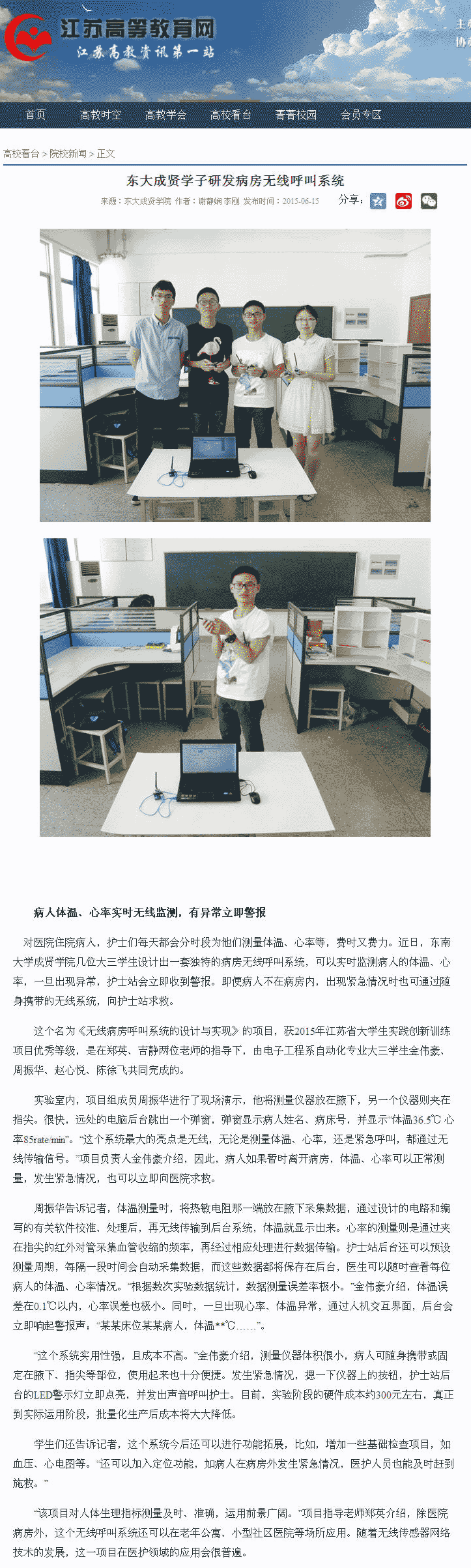 【江苏高等教育网】艳照门 学子研发病房无线呼叫系统