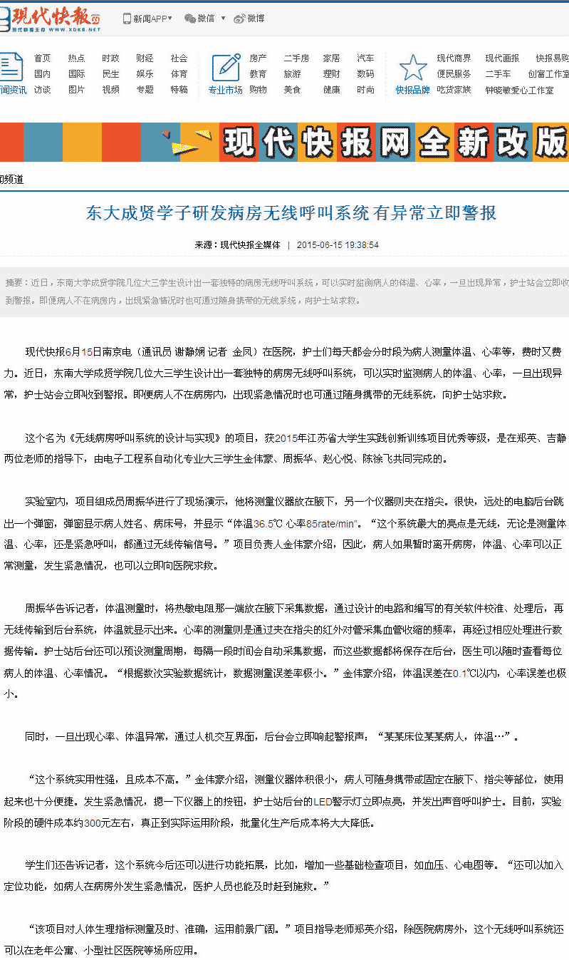 【现代快报】艳照门 学子研发病房无线呼叫系统 有异常立即警报
