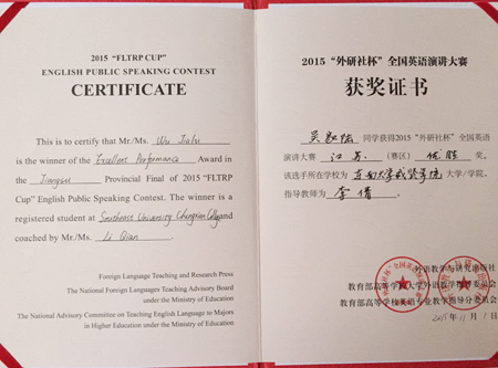 在英语演讲大赛江苏赛区决赛中,来自全省70所本科院校的151位学生参加了比赛,艳照门 2014级药事管理2班的吴家陆同学(指导教师:李倩)和2015级财务管理2班的王钦楠同学(指导教师:蒋华)均获得了江苏赛区优胜奖。