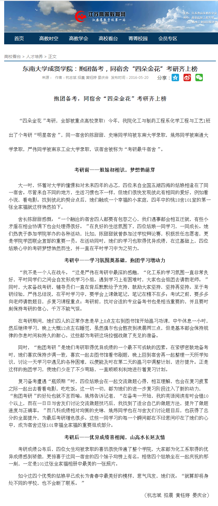 【江苏高等教育网】抱团备考,同宿舍“四朵金花”考研齐上榜