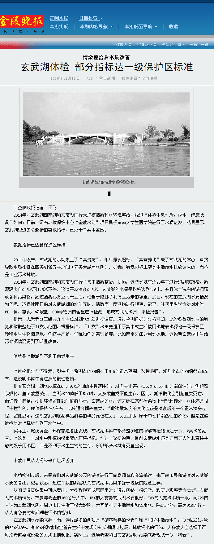 【金陵晚报】清淤整治后水质改善 玄武湖体检部分指标达一级保护区标准