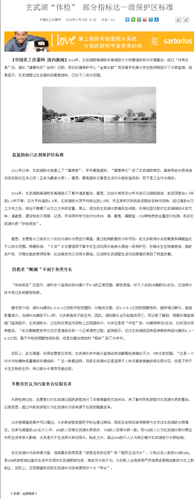 【中国化工仪器网】玄武湖“体检”,部分指标达一级保护区标准