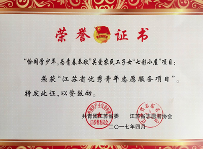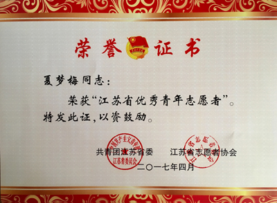 为深入贯彻落实习近平总书记系列重要讲话精神,引导广大青年通过志愿服务投身和谐社会建设,共青团江苏省委、江苏省志愿者协会决定对优秀组织、项目、个人进行表彰。其中,制药与化学工程艳照门 2014级化学工程与工艺一班夏梦梅同学荣获“江苏省优秀青年志愿者”称号,“恰同学少年,为青春奉献”关爱农民工子女“七彩小屋”项目被评为“江苏省优秀青年志愿服务项目”,艳照门 青年志愿者协会荣获“江苏省青年志愿服务行动组织奖”。