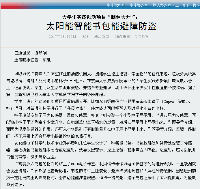 【金陵晚报】大学生实践创新项目“脑洞大开”:太阳能智能书包能避障防盗