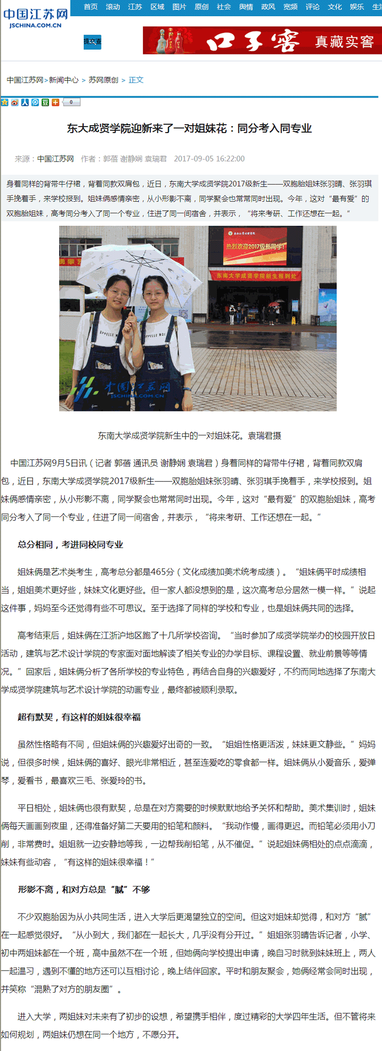 【中国江苏网】东大艳照门 迎新来了一对姐妹花:同分考入同专业