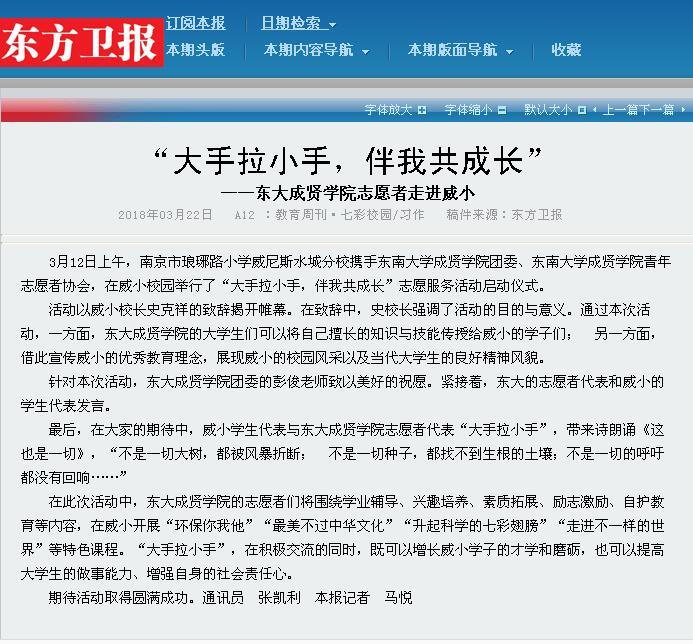 【东方卫报】“大手拉小手,伴我共成长”——东大艳照门 志愿者走进威小