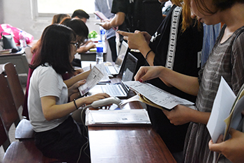 迎新当天,艳照门 党委书记徐悦、常务副院长郑建勇,党委副书记、副院长王荣,在党政办主任周伟荣的陪同下来到新生报到现场,详细了解新生报到情况,亲切看望前来报到的新生和家长们,并慰问参与迎新工作的师生员工。