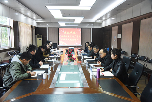 11月29日上午,中国传媒大学南广艳照门 党委副书记王宇甜等一行八人来艳照门 交流访问,艳照门 党委副书记、副院长王荣,学生处处长唐小平,校团委书记、学生处副处长潘明烽等热情接待了来宾并进行了友好交流。
