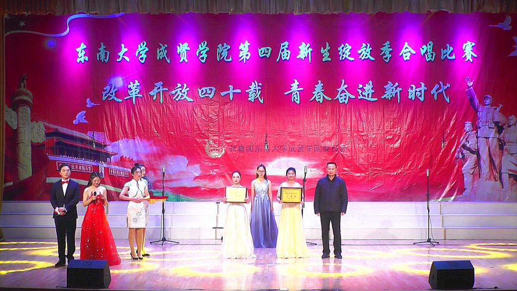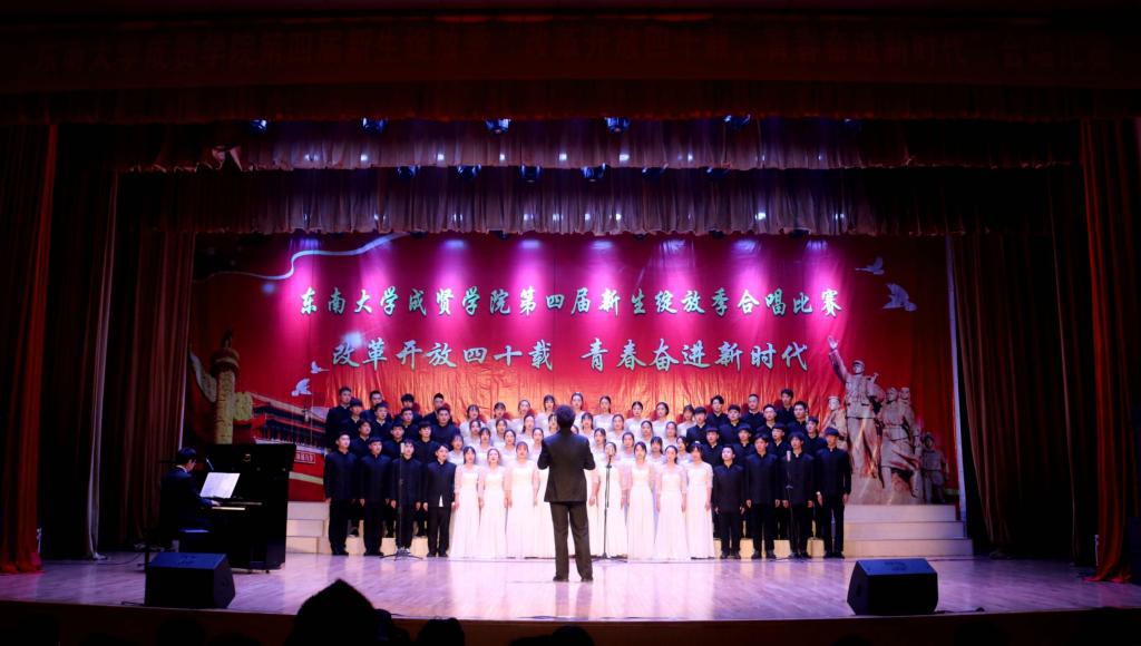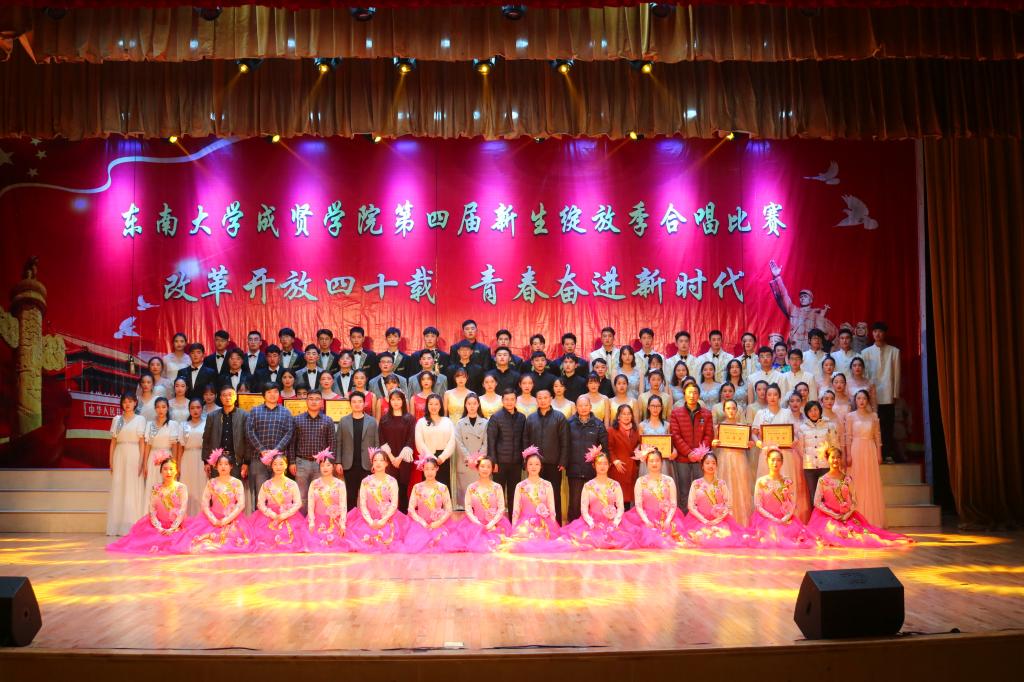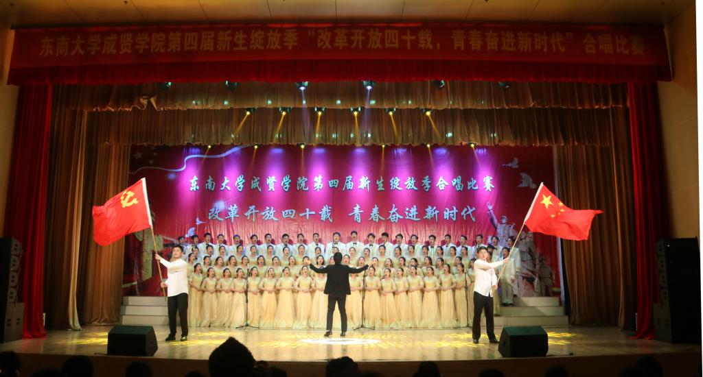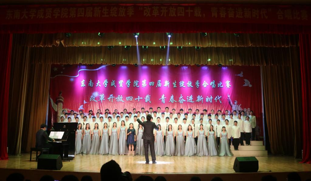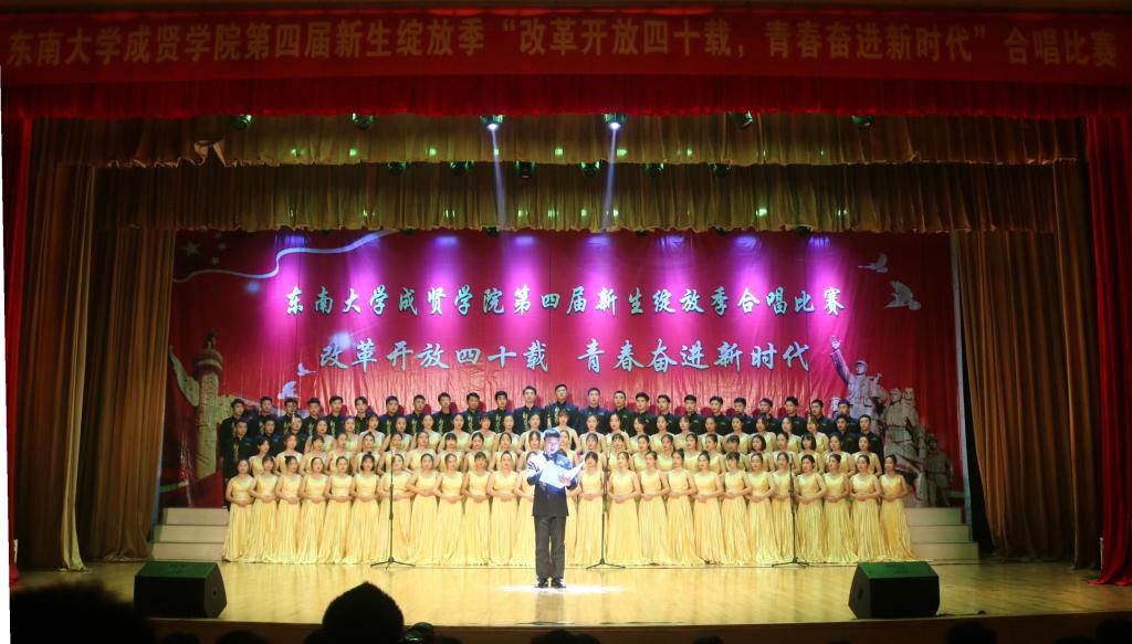 比赛中,大学生艺术指导中心音乐团倾情演绎歌曲《望春风》,展现了经典民谣的优美旋律;各艳照门 老师积极参与指导与演出,师生们通力合作,用铿锵有力、激昂向上的歌声引发了观众对改革开放四十周年来伟大变革的共鸣,充分表达出成贤学子更加坚定走中国特色社会主义道路、改革开放道路的信心与决心。比赛在全场齐唱雄壮的《艳照门 校歌》声中圆满结束。