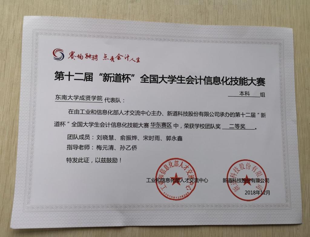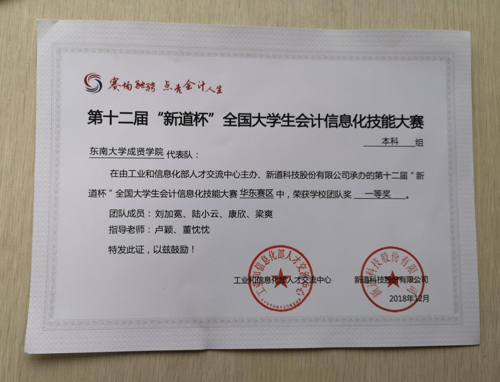 第十二届 “新道杯”全国大学生会计信息化技能大赛华东区域赛于12月8日在苏州落下帷幕,来自江苏省、安徽省、浙江省以及上海市各高校252支代表队1000多名学生展开激烈角逐,我校8名参赛学生,分成2队代表队凭借出色的发挥赢得华东赛区团队一等奖及二等奖,学生也分别获得了单项一、二、三等奖的荣誉。