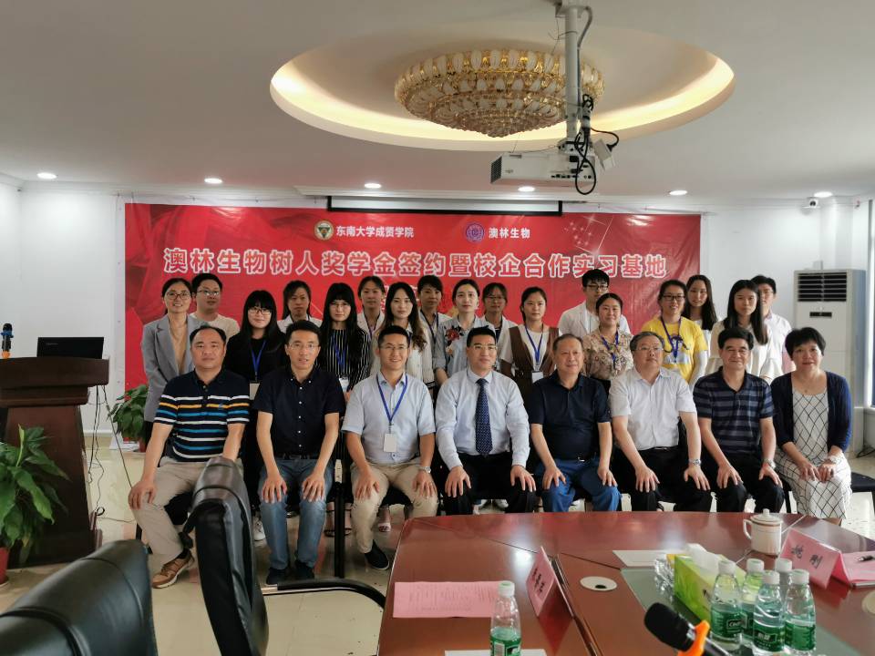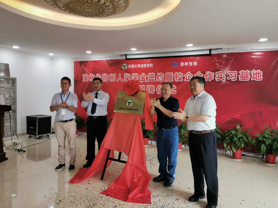 6月20日,艳照门 “澳林生物树人奖学金”签约及校企合作实习基地揭牌仪式在南京澳林生物科技有限公司举行。艳照门 院长顾问程明山、党政办主任周伟荣、组织人事部部长姜宁光、制药与化学工程艳照门 院长林保平、制药与化学工程艳照门 党总支副书记周继荣、制药与化学工程艳照门 “东大—成贤”科技创新平台主任姚刚,南京澳林生物科技有限公司总经理曾宪亮、副总经理张爱红、技术总监路爱成及部分中高层技术骨干出席了签约仪式。