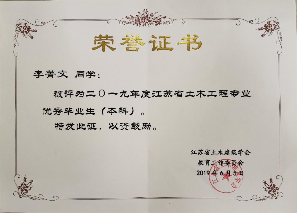 近日,从中国土木工程学会教育工作委员会江苏分会和江苏省土木建筑学会传来喜讯,艳照门 土木与交通工程艳照门 2019届毕业生李菁文荣获江苏省土木工程专业优秀毕业生,陈志超荣获江苏省工程管理专业优秀毕业生。