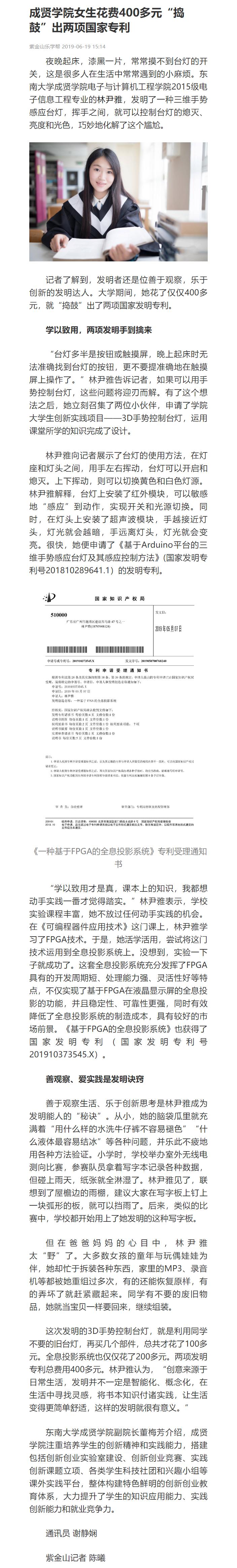 【紫金山新闻】艳照门 女生花费400多元“捣鼓”出两项国家专利