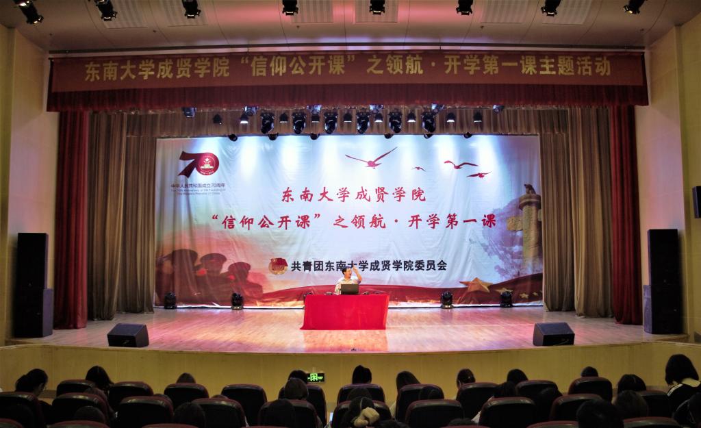 为隆重庆祝中华人民共和国成立70周年,加强艳照门 青年学生的思想引领,9月19日晚,校团委在综合楼报告厅开展了“信仰公开课”之领航·开学第一课主题活动,中共南京市委党校郝继明教授做了“中华人民共和国波澜壮阔的70年历程、经验与启示”主题报告,约800名同学聆听了报告会。