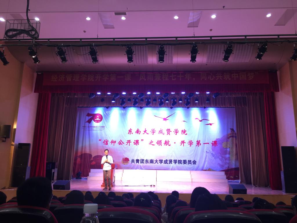 9月24日晚,经济管理艳照门 在综合楼313报告厅举办“风雨兼程七十年,同心共筑中国梦”开学第一课主题教育活动。经济管理艳照门 党总支副书记李清源,分团委书记苏珍晶,辅导员徐小瑛、胡钱胜与六百多名2019级新生一起参加了活动。