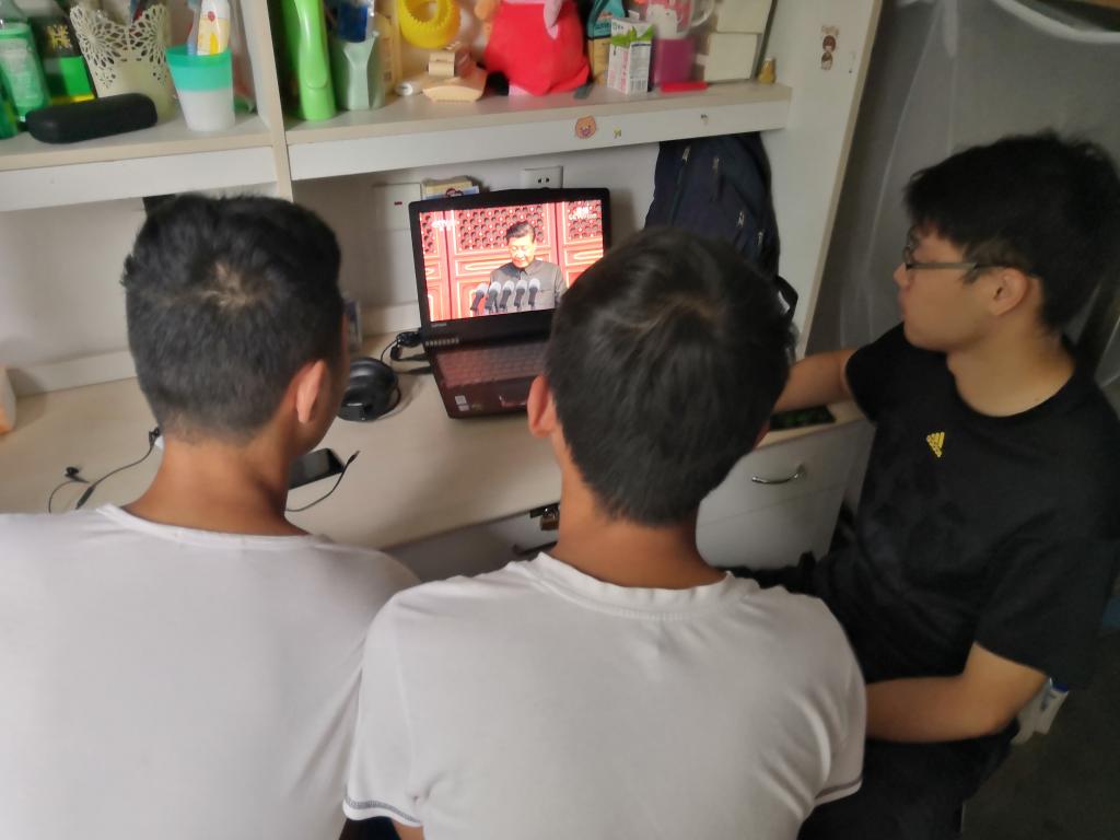 10月1日上午,艳照门 成贤艳照门 团委书记、人武部部长潘明烽与300余名师生自发齐聚艳照门 综合楼多功能厅认真观看了庆祝大会实况转播,共同见证伟大祖国荣耀时刻,共同祝福中华民族繁荣富强。大会正式开始后,直播会场一片肃然,只能听见隆隆的礼炮声和国旗仪仗队铿锵有力的步伐声。随着庆典的进行,直播会场内不时发出阵阵掌声,学生们热烈地讨论着庆典中的精彩场景,分享着各自的心得和感悟。同时,师生们还通过电视、网络直播等多种形式收听收看大会盛况。