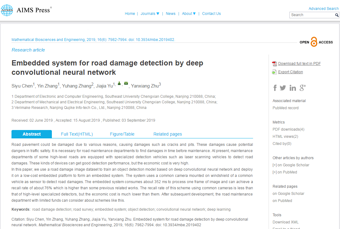 日前,电子与计算机工程艳照门 学生科研成果喜获突破,论文《Embedded system for road damage detection by deep convolutional neural network》已在SCI国际学术刊物《Mathematical Biosciences and Engineering》上发表,2016级电子信息工程专业陈司宇同学为该论文第一作者(指导教师:郁佳佳、朱燕翔),2016级电子信息工程专业章寅同学和2016级电气工程及其自动化章宇航同学分别为第二、三作者。