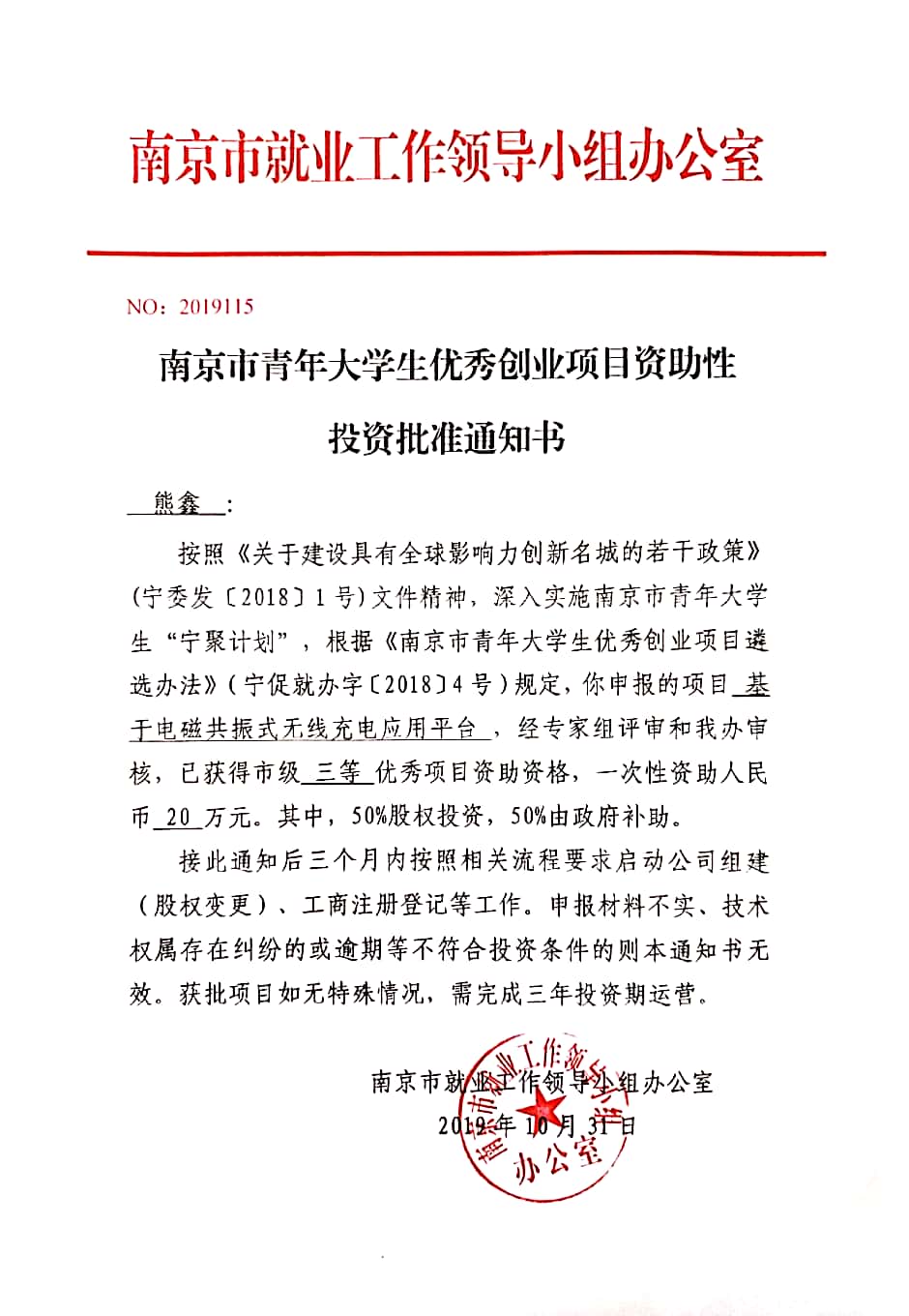 在2019年南京市大学生优秀创业项目遴选中,艳照门 2016级计算机科学与技术专业熊鑫同学带领的创业团队项目《基于电磁共振式无线充电应用平台》获得三等优秀项目资助资格,获政府一次性资助20万。