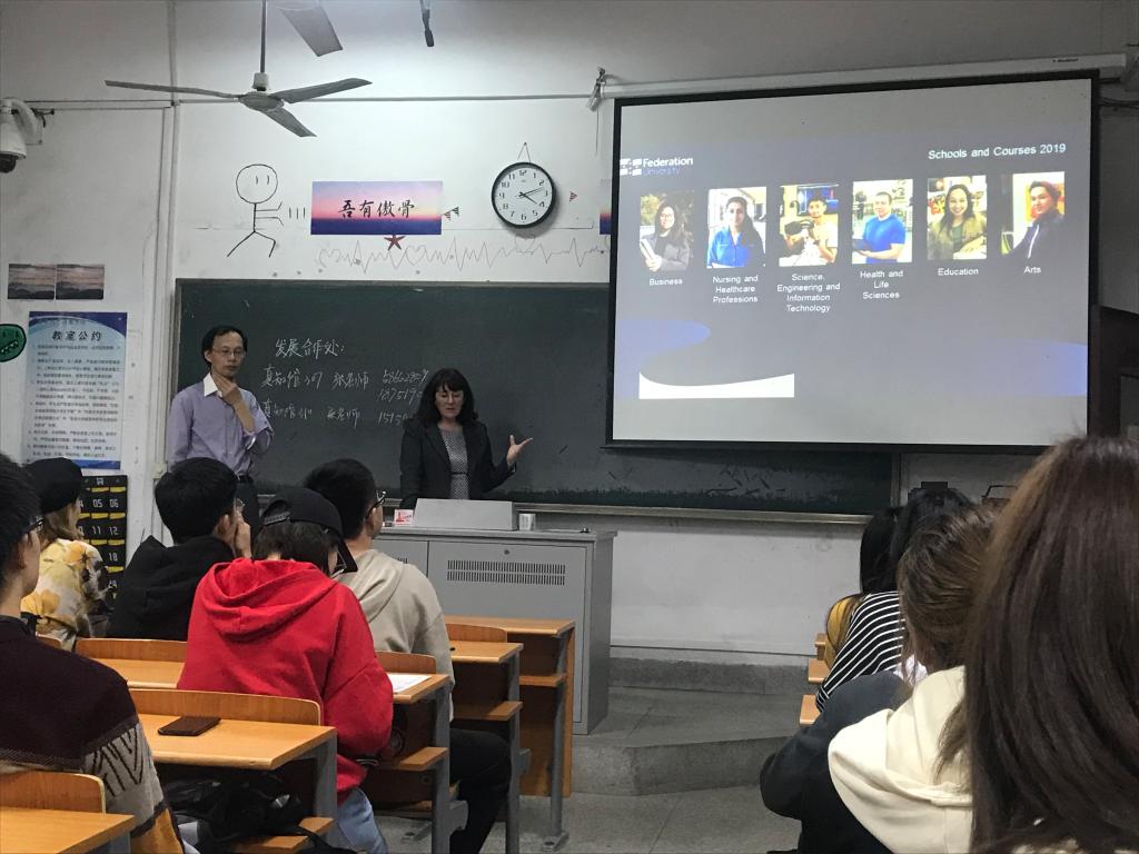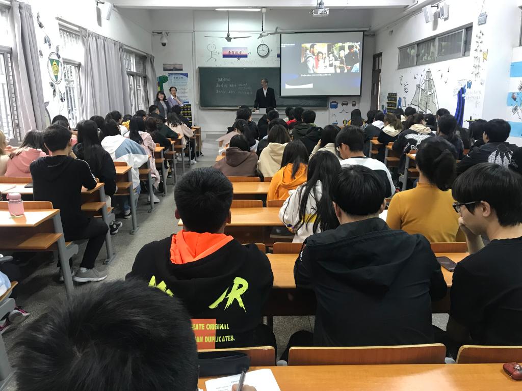 会议结束后,陆国军教授和Melissa Staley项目经理在金坛院103室为学生们做了学生交流合作项目专场宣讲会,100多名同学参加了此次宣讲会,宣讲会由发展合作处张务一老师主持。会上,Melissa Staley项目经理从艳照门 概况、申请专业、排名情况、收费标准、项目优势、奖学金政策、入学模式等方面向学生们详细的讲解了关于澳大利亚联邦大学学生项目的具体情况。在场的学生反响热烈,踊跃提问,陆国军教授耐心细致地回答了同学们的问题。