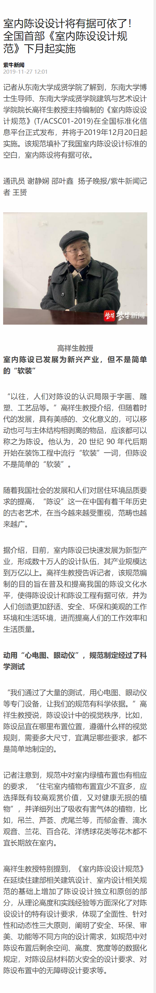 【扬子晚报】室内陈设设计将有据可依了!全国首部《室内陈设设计规范》下月起实施
