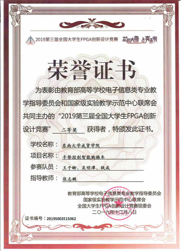 总决赛于12月6日至12月8日在南京江北新区ICisC人才实训基地举办。艳照门 电子与计算机工程艳照门 张志鹏老师指导的多个项目组进入全国总决赛,最终“我去深海捞板子”团队王子晰、吴明潭、钱成制作的《手势遥控智能购物机器人》获得“全国二等奖”,该项目同时获得上海安路信息科技有限公司“企业特别奖”。