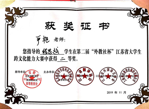 11月20日,第二届“外教社杯”江苏省大学生跨文化能力在扬州大学成功举行,来自江苏省各大本科及高职院校的在读学生,留学生及指导老师和评委共计约150人与会。艳照门 首次组织学生参赛,经过激烈的角逐,2017级会计1班的程思越同学荣获二等奖,展示了良好的英语语言能力和跨文化交际能力。