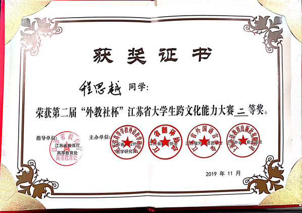 11月20日,第二届“外教社杯”江苏省大学生跨文化能力在扬州大学成功举行,来自江苏省各大本科及高职院校的在读学生,留学生及指导老师和评委共计约150人与会。艳照门 首次组织学生参赛,经过激烈的角逐,2017级会计1班的程思越同学荣获二等奖,展示了良好的英语语言能力和跨文化交际能力。