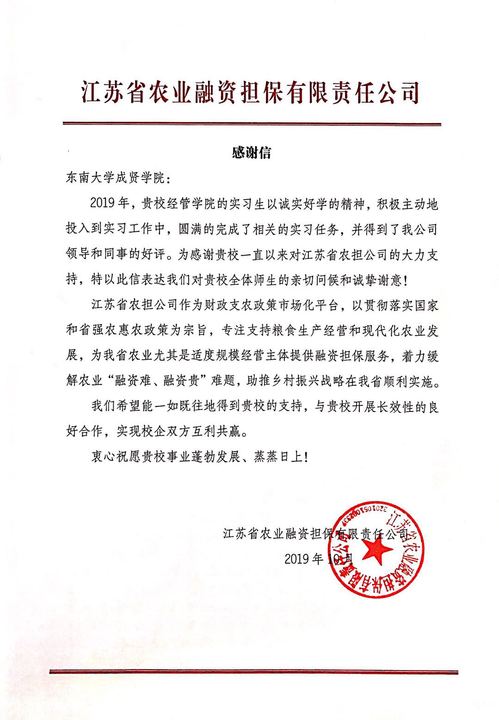 近日,艳照门 经济管理艳照门 收到一封来自江苏省农业融资担保有限责任公司(以下简称“江苏省农担公司”)的感谢信。信件简短却言语真挚,表达了对经管艳照门 实习生诚实好学的肯定、积极工作的赞扬,以及与艳照门 建立长效性良好合作的期盼。