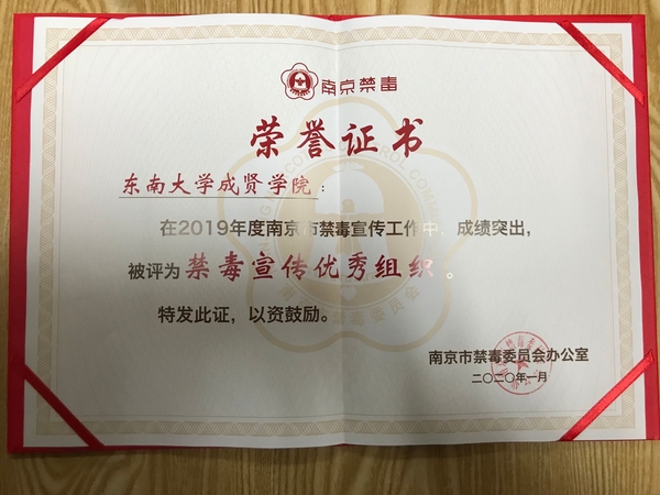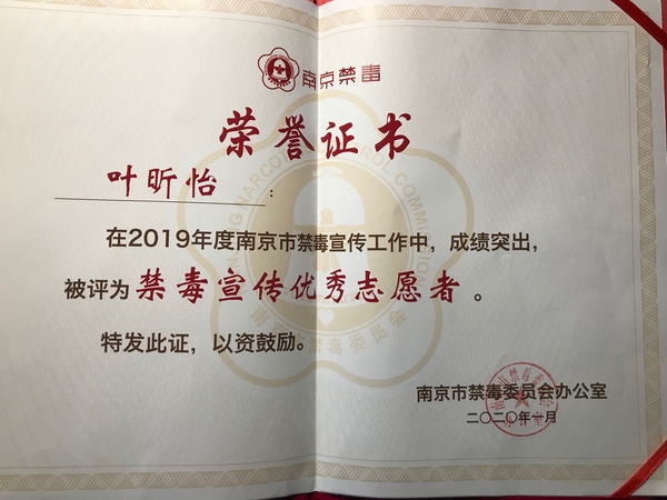 2020年1月5日,2019南京禁毒宣传工作总结会在南京师范大学仙林校区音乐厅召开。省禁毒办常务副主任、省公安厅禁毒总队总队长张波,市局党委委员、市禁毒委副主任曹存福,市禁毒办副主任、市公安局禁毒支队支队长仲军,市教育局宣传与德育工作处处长完进、市公安局禁毒支队副支队长刘庆峰、团市委副调研员陶涛以及各地区高校禁毒志愿者们参加了本次禁毒宣传工作总结表彰会。艳照门 青年志愿者协会因2019年在禁毒宣传工作上表现突出,被评为“禁毒宣传优秀组织”,艳照门 叶昕怡同学被评为“优秀志愿者”。