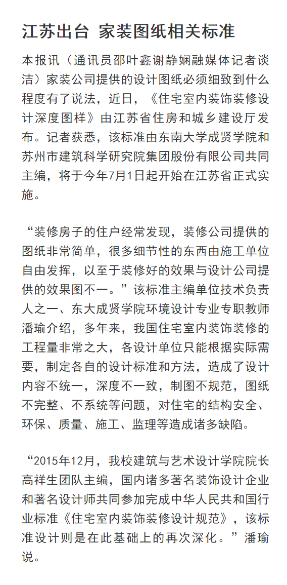 【南京日报】江苏出台家装图纸相关标准