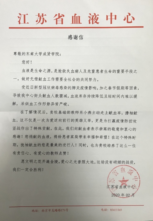 来自江苏省血液中心的感谢信