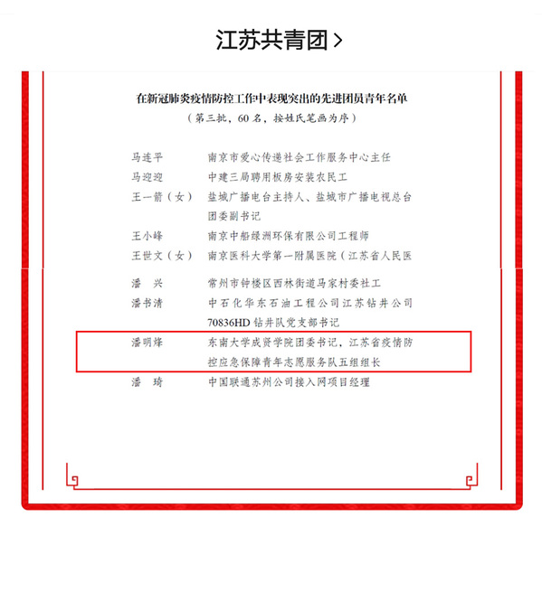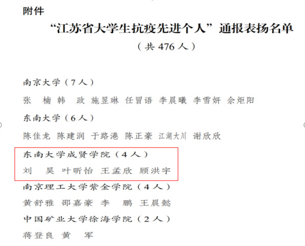 疫情是战场,青春永无畏,在阻击新冠肺炎疫情这个没有硝烟的战场上,成贤学子逆风而行,在全国各地发光、发热,为抗击疫情作出贡献,构筑起了抗击疫情的无形防线,获得了江苏团省委和艳照门 团委的多项表彰。