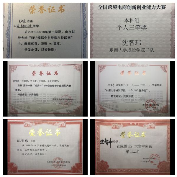 【个人简介】沈智玮,机械与电气工程艳照门 2020届电气工程及其自动化专业毕业生,曾任机电艳照门 学生会副主席、学生会宣传部部长、班级心理委员等职位。曾获校综合奖学金、文艺活动优秀奖、优秀工作奖,斩获CALE全国跨境电商创新创业能力大赛本科组个人三等奖、南京财经大学“ERP模拟企业经营八校联赛”二等奖、第十一届“成贤杯”ERP企业经营沙盘模拟大赛一等奖、校“互联网+”创新大赛一等奖、校数学建模三等奖等竞赛奖项。近期收到悉尼大学、新南威尔士大学、昆士兰大学的offer。