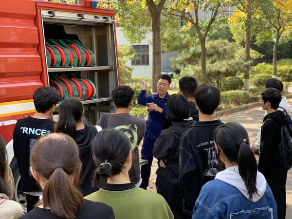 消防破拆、火场灭火、火场及应急处置救援等在新闻中看到的场景,在校园就可以亲身体验。11月9日,消防器材及实景体验活动与消防演练活动在校园开展。通过近距离接触专业的消防实战装备,师生现场体验了多场景多介质的灭火实操、消防战斗服及空气呼吸器穿戴,通过真实的场景模拟,增强了师生的代入感与实操感,更好地掌握了消防器材的使用方法及处置初期火灾、逃生自救的能力。南京消防高新大队的队员还现场介绍了部分应急救援设备。