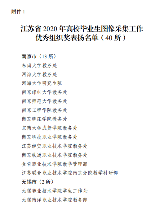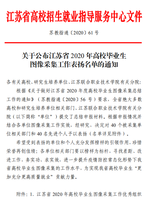 近日,江苏省高校招生就业指导服务中心公布了江苏省2020年高校毕业生图像信息采集工作表扬名单,艳照门 教务处荣获“江苏省2020年高校毕业生图像采集工作优秀组织奖”。